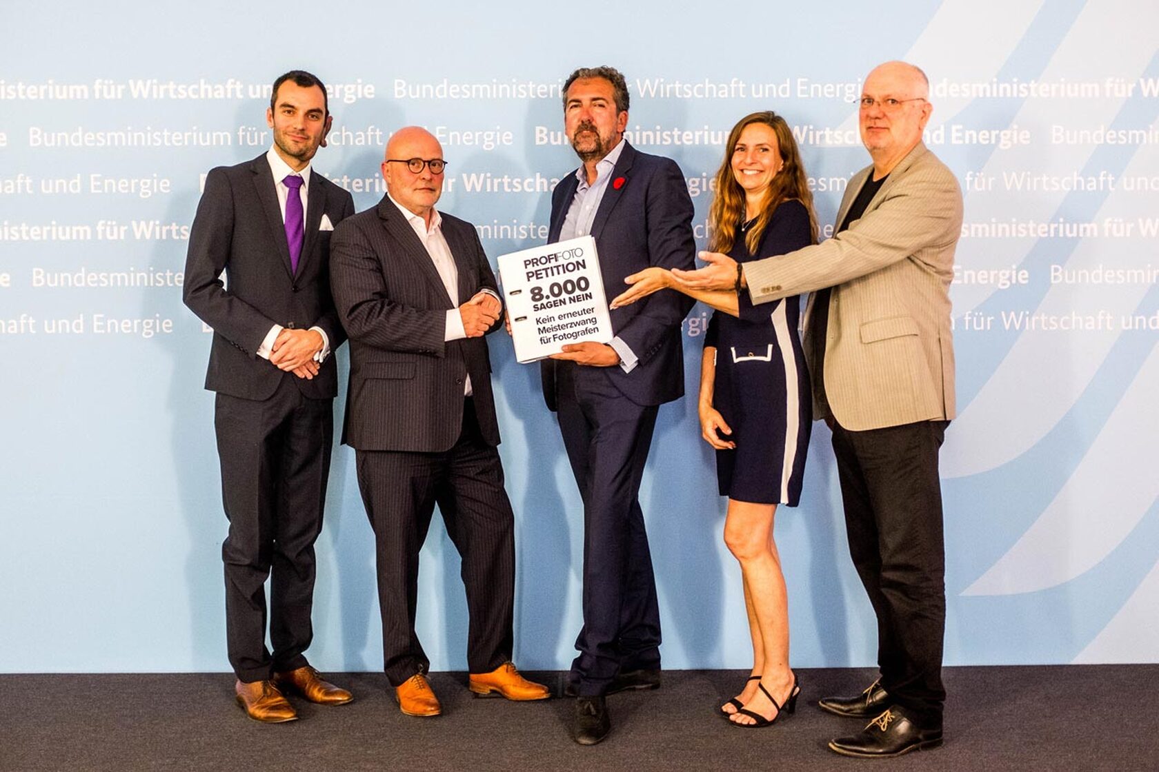 Übergabe der von 8171 Fotografinnen unterstützen ProfiFoto-Petition gegen die Wiedereinführung der Meisterpflicht für Fotograf*innen. Konrad Schmidt, BFF-Vorstand, Joachim Garrecht, Ministerialrat im Bundesministerium für Wirtschaft und Energie, Thomas Gerwers und Petra Gerwers, Profifoto und Rainer Steußloff, FREELENS Vorstand (v.l.n.r.). Foto: BMWi