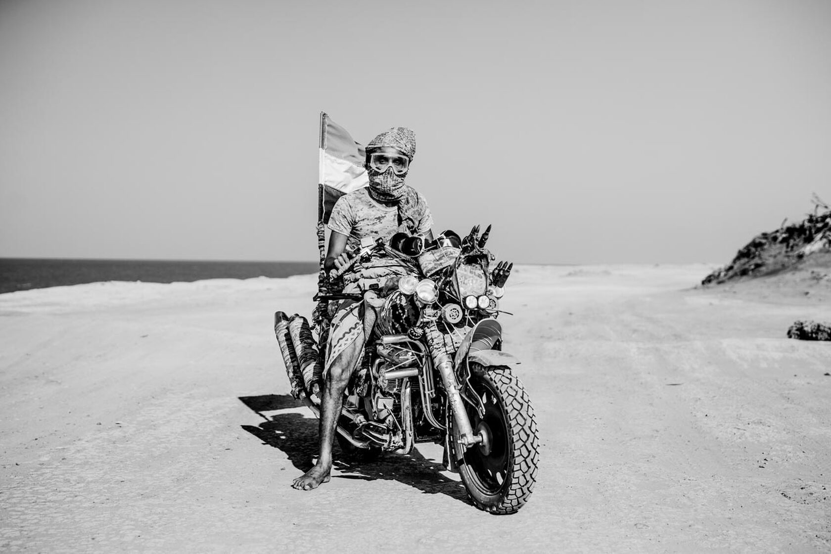 »In der Nähe der Basis einer eher trägen ›schnellen Eingreiftruppe‹ einer salafistischen Miliz kam uns dieser Mann entgegen. Vor der Kulisse des Krieges wirkte er bizarr. Er stellte sich vor, war aber nicht sonderlich gesprächig und fuhr gleich weiter. Wir haben gerätselt, was es mit ihm auf sich hat: Dickes Motorrad aber keine Schuhe. Die Flagge am Heck ist die eines vereinten Jemens aber auf dem Scheinwerfer steht der Name einer lokalen Miliz, die von einem unabhängigen Staat träumt.«