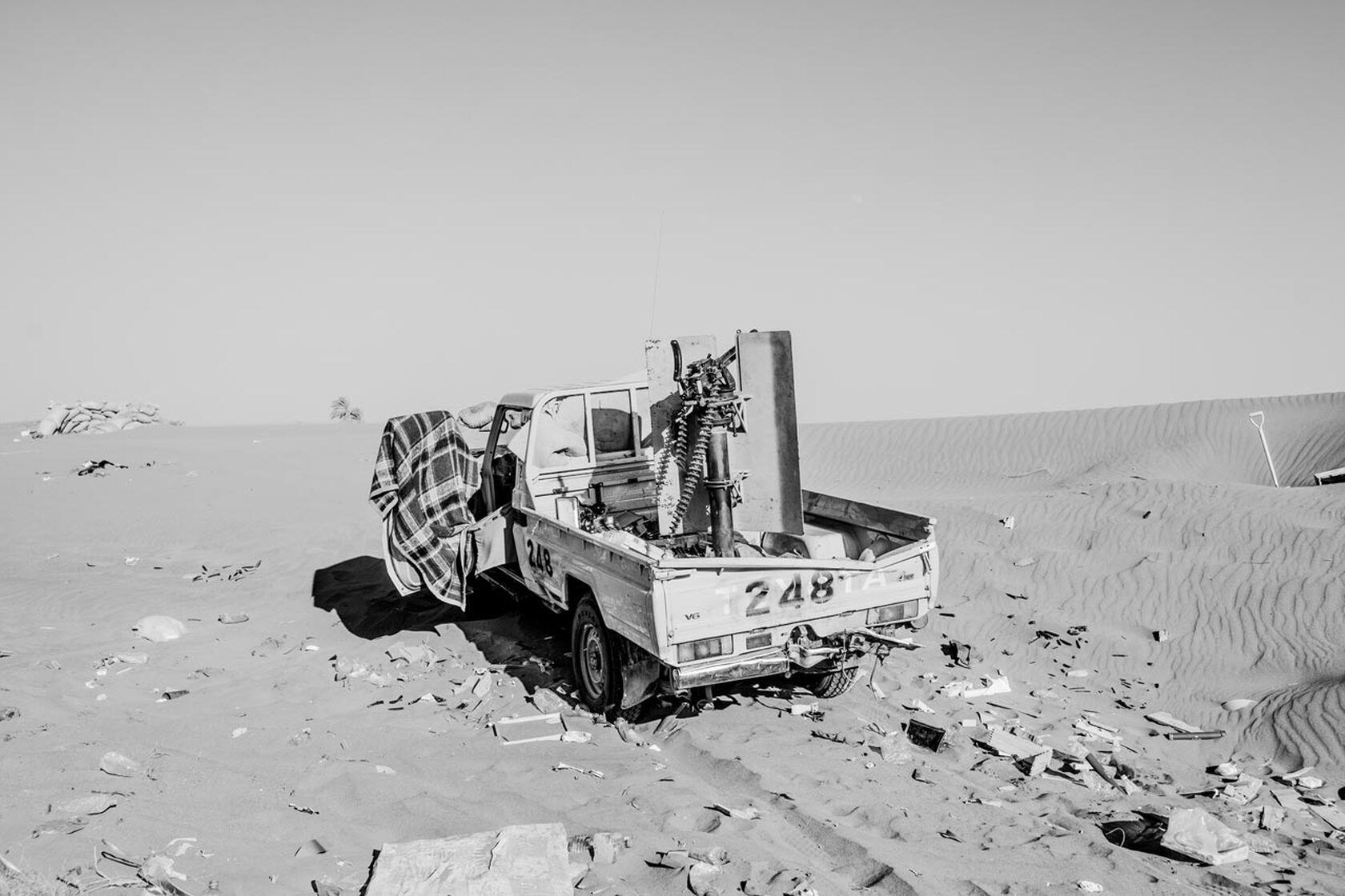 Es gibt dann aber auch Situationen, wie ich sie letzten November im Jemen erlebt habe, da bin ich zwar an der Front, aber was man letztlich sieht, ist ein Pickup mit Maschinengewehr, der verloren auf einer Düne in der Wüste rumsteht, die Frontscheibe mit einer Decke abgedunkelt, so dass man in der Kabine schlafen konnte. Kein aufregendes Motiv, aber das war das Bild, welches ich von dieser Situation mitgenommen habe: Ein chaotischer Krieg im Zustand der Trägheit. Es entsprach viel mehr der Stimmung, als wenn ich Kämpfer mit Waffen fotografiert hätte …