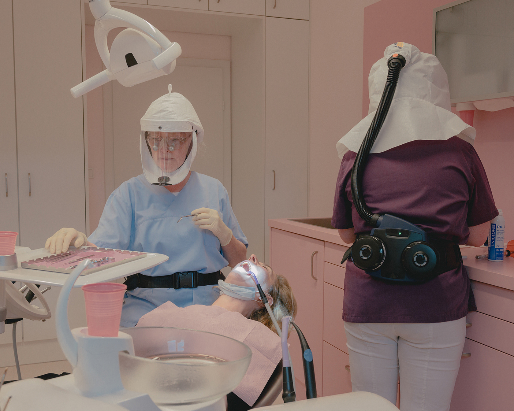 About the Days ahead. Meine Tante Melanie (Mitte) bei einer Zahnbehandlung. Die Zahnärztin Dörte Stübbe kaufte spezielle Schutzhelme, um sich und ihre PatientInnen vor dem Viruszu schützen, 29. April 2020, Vlotho, Deutschland. © Ingmar Björn Nolting