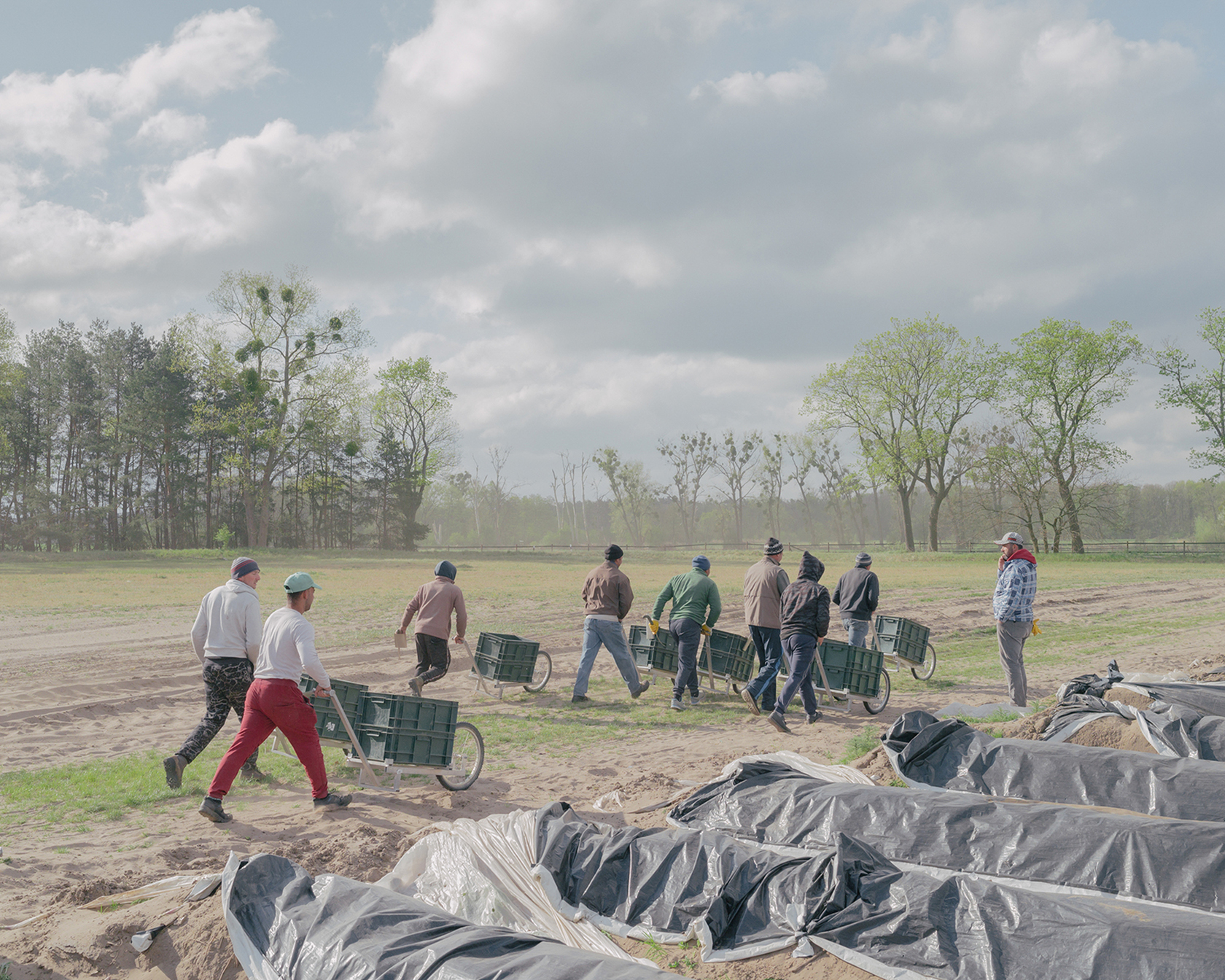 Rumaenische Erntehelfer auf Spargel Plantage in Staffelde waerend Corona Lockdown am 25. April, 2020